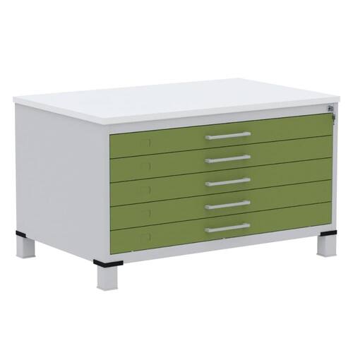 Mapoteca 5 Gavetas Pandin 120 cm (Larg) Inmetro Tampo MDP Branco Estrutura Aço Cinza Gavetas Verdes