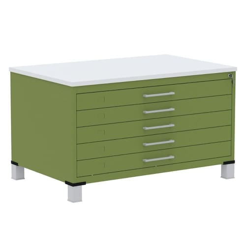 Mapoteca 5 Gavetas Pandin 120 cm (Larg) Inmetro Tampo MDP Branco Estrutura e Gavetas em Aço Verde - Cinza