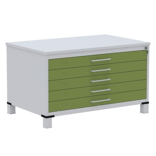 Mapoteca 5 Gavetas Pandin 120 cm (Larg) Inmetro Tampo MDP Cinza Estrutura Aço Cinza Gavetas Verdes