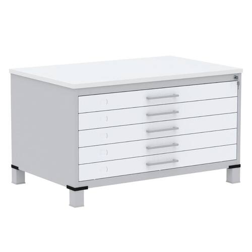 Mapoteca 5 Gavetas Pandin 120cm (Larg) Inmetro Tampo MDP Branco Estrutura Aço Cinza Gavetas Brancas