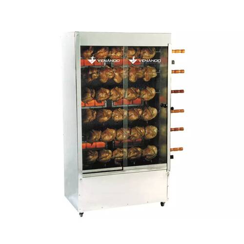A Máquina 30 Frangos Venâncio 6 espetos A gás Queimador Infravermelho SGF3 é a escolha perfeita para quem busca alto desempenho, economia e durabilidade no preparo de frangos e outros alimentos assados. Com capacidade para 30 frangos distribuídos em 6 espetos, este equipamento atende perfeitamente restaurantes, padarias, lanchonetes, supermercados e rotisserias que desejam oferecer assados saborosos e padronizados. Produzida com a qualidade reconhecida da Venâncio, a assadeira conta com estrutura robusta em tubo SAE 1020, acabamento externo em aço inox AISI 430 e interior totalmente esmaltado a fogo, o que garante resistência, fácil limpeza e um visual moderno. Seu sistema de aquecimento a gás com queimadores infravermelhos assegura assados uniformes, suculentos e com economia de Gás. O motor bivolt (127V / 220V) com chave seletora e a transmissão por sem-fim e coroa proporcionam rotação constante dos espetos, resultando em cozimento homogêneo. Além disso, a SGF3 oferece rodízios com trava, facilitando o deslocamento seguro do equipamento, e vidros amplos com roldanas, que garantem uma visualização total dos frangos durante o assado.