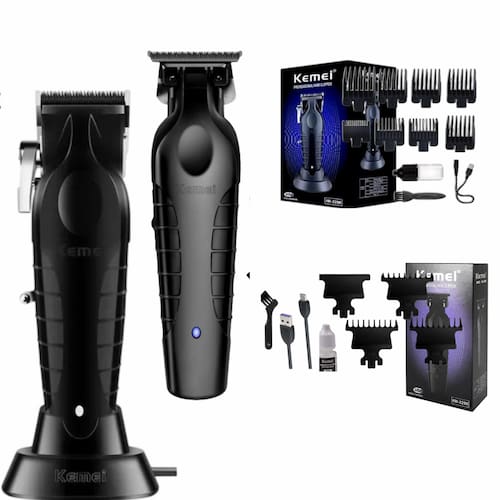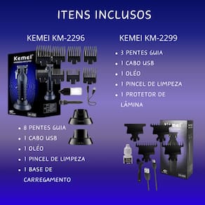 1 Maquina de Cortar Cabelo KM2296 + 8 pentes de altura e acessórios. 1 Maquina de Acabamento KM2299 + 3 pentes de altura e acessórios.