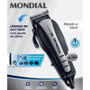 Maquina Cortar Cabelo Mondial 10w Inox/preta 220v A Mondial é a marca dos eletroportáteis de maior sucesso no mercado. É líder em design e variedade de produtos. Possui uma linha de itens essenciais para sua casa, diversão e beleza. Apresentamos o cortador de cabelos. Ele lhe proporciona alto padrão de eficiência e qualidade, garantindo sucesso no corte do seu cabelo. Possui acabamento e lâminas super-resistentes em aço Inox, alta potência e alavanca de ajuste para regular a altura do corte. Possui com 2 lâminas, 4 pentes, 1 tesoura, 1 escova de limpeza, 1 capa protetora de lâminas e 1 óleo de manutenção. Seu cortador foi cuidadosamente alinhado na fábrica, mas se o alinhamento estiver errado você pode ajustá-lo de acordo com seu gosto. Da mesma forma com as lâminas, que devem ser realinhadas se removidas para a limpeza ou substituição. Design super moderno, pequeno, cabe em uma pequena nécessaire, e foi usada ama combinação das cores preto com prata. Cortar ou aparar os seus cabelos pode ser mais rápido do que você imagina. Basta liga-a na energia elétrica e usá-la com a maior facilidade, em qualquer lugar.Características: Recarregável SimAparador de pêlos SimPortátil SimFunções Cortar e aparar os cabelosPotência (W) 10WConsumo (KW/h) 0,01Kw/hAlimentação Alternativa Somente Energia ElétricaConteúdo da Embalagem 01 Cortador de Cabelo; Manual de Instruções e Manual de Assitência TécnicaDimensões produto (cm) - AxLxP 24,5 X 18,0 X 6,0cmPeso produto (kg) 0,76kgDimensões embalagem AxLxP 21,90 x 18,00 x 6,00cmPeso embalagem 0,62kg Ean: 7898490164066