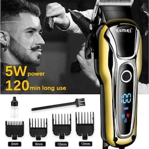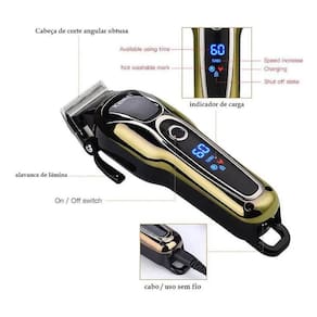 atencao nao usar a maquina ligada no cabo de energia características do produto:quantidade de pentes: 4 é sem fio: sim características gerais:marca:kemei modelo:km-1990tipos de cabeças: fixa é sem fio:simé lavável:não é apta para viagem:simé apta para bebês:não especificações:funções: cortador de cabelo tipo de alimentação:bateriaquantidade de pentes: 4 3, 6, 10, 13mm quantidade de posições:1potência:5 wrendimiento:inclui bateria recarregável: sim outros:acessórios incluídos:sim descriçãomotor potente com duas velocidades ajustável, adequado para todos os tipos de corte de cabelo. Uma conveniente alavanca da lâmina para ajustar o comprimento da lâmina, proporcionando um desempenho mais suave e mais preciso em seu cabelo. Há uma tela de lcd sobre o corpo, que pode exibir a energia restante intuitiva. Lâmina de aço inoxidável para aparar o cabelo rapidamente e com precisão, nenhum cabelo ficar preso e não ferir a sua pele. Equipado com 4 diferentes comprimento limite combs 3mm, 6mm, 10mm, 13mm ,você pode facilmente controlar o comprimento do cabelo que você deseja cortar e criar vários estilos de cabelo. Cabo e sem fio de dupla utilização, não mais se preocupar com nenhuma eletricidade, mais conveniente. Após 3 horas de carga completa, ele pode ser utilizado continuamente por 120 minutos. Especificação:material: abstensão: 110-240 vfrequência: 50/60hzpotência: 5 wtempo de carregamento: 3 horas ou ate aparecer carga completa no visor usando o tempo: 120 minutos manual do usuário é errado para o tempo de carga e tempo de uso conteúdo do pacote:1 x hair clipper1 x lâmina de capa protetora4 x limite combs 3, 6, 10, 13mm 1 x pente1 x escova de limpeza1 x adaptador