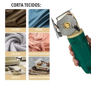 Máquina de corte de tecido tipo bananinha com lâmina hexagonal de 70 mm, ideal para uso industrial. Possui 45W de potência e opera em 220V. Inclui trilho e é adequada para diversos tipos de tecidos como couro, pano, chiffon, tapete, linha e algodão. Acompanha acessórios e manual em português.Funções