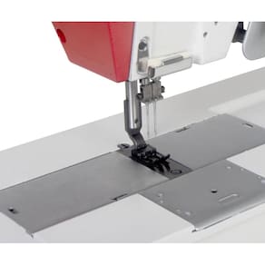 Máquina de costura industrial pespontadeira alternada para confecção de vestuário com tecidos leves e médios.