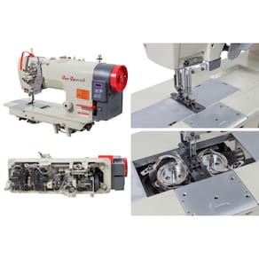 Máquina de costura industrial pespontadeira alternada para confecção de vestuário com tecidos leves e médios.
