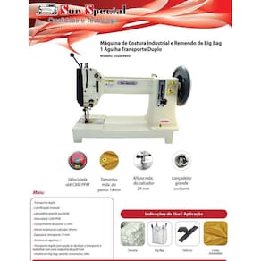 Para fechamento, pregar alças e remendas de big bags, sacaria, rafia ou encerados, também conhecida como ponto louco por possuir alavanca para elaborar costuras livres esquerda/direita, frente/atrás e circular.