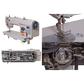 Máquina de costura industrial reta eletrônica transporte duplo para confecção de vestuário com tecidos médios.