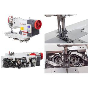 Máquina de costura industrial reta eletrônica transporte triplo para confecção vestuário com tecidos médios e pesados.