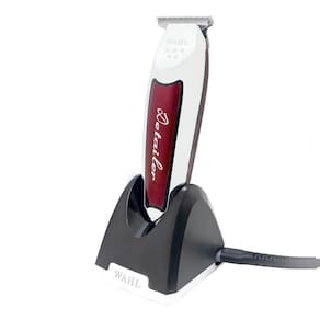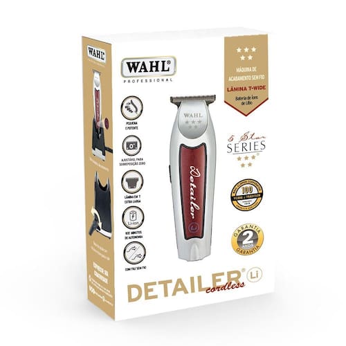 Máquina de acabamento sem fio bivolt. Lâmina T-Wide Wahl de alta precisão para acabamentos perfeitos sem fio, proporcionando mobilidade, comodidade e conforto ao profissional. Alavanca de ajuste, proporciona cortes de altura 0,3mm a 0,8mm. Motor giratório, 60 min de uso e 60 min de recarga. Contém: 3 pentes, suporte para recarga, pincel de limpeza, carregador e óleo protetor de lâmina.