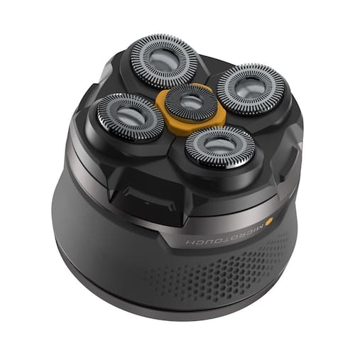 Barbeador elétrico Microtouch Titanium — Barbeador de cabeça e rosto recarregável para homens, barbeador sem fio, barbear hipoalergênico úmido/seco, aparador de cabeça de precisão, alimentado por lítio, alimentado por bateria — O barbeador de cabeça Microtouch Titanium é a evolução dos barbeadores elétricos para homens carecas, 5 cabeças flutuantes independentes unidas a titânio em aço inoxidável. Por 5 vezes a área de cobertura de uma navalha. - O barbeador elétrico flutuante de 5 cabeças contorna independentemente da curvatura da cabeça para um barbear mais suave, seguro e confortável. - O barbeador de cabeça de titânio Microtouch é resistente à água e tem uma câmara de captura de cabelo embutida. Este barbeador careca reúne todos os seus enfeites para facilitar a limpeza após o barbear. - Equipado com lâminas revestidas hipoalergênicas e duráveis em aço inoxidável alemão que resistem ao embotamento. - A bateria movida a lítio oferece 80 minutos de funcionamento contínuo com uma carga completa. Inclui recurso de bloqueio de viagem.