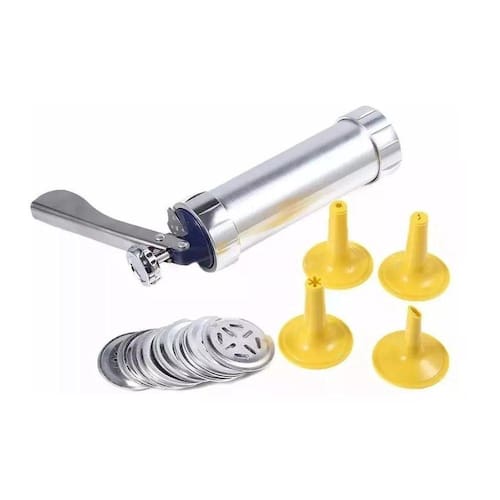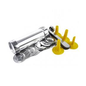 Máquina para fazer biscoitoMuito mais praticidade e versatilidade na confecção dos biscoitos e na escolha das formas. Acompanham 20 formas metálicas e 4 bicos plásticos de confeitar. Também decora bolos. É super rápida e prática.Basta preparar a massa, colocá-La no tubo, inserir a forminha, regular a espessura e começar a clicar a máquina. Depois é só assar.Cor: PrataGarantia: 1 anoManual de Instruções ilustrado em inglês.Material: Metal e plástico.Dimensões 21,5 cm A x 5,5 cm D x Cabo 16,5 cm C .Peso 400 g.