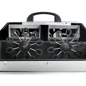 DESCRIÇÃO A Máquina de Bolha Bubble Pro da marca Luminos possui dois discos em formato de ventoinhas que criam enormes quantidades de bolhas grandes de sabão ao mesmo tempo que produz uma corrente ascendente que faz as bolhas subirem no ar. O seu tanque de fluido produzido com plástico resistente evita a corrosão e o vazamento do líquido. A Bubble Pro também conta com 300W de potência, tensão bivolt, alça e rodas embutidas que facilitam o seu transporte. Esta máquina de bolha profissional é ideal para utilização em festas e buffets, podendo ser controlada por sistema DMX ou por controle remoto sem fio que acompanha o produto. MARCA Luminos MODELO Bubble Pro 90 dias OBSERVAÇÃO 2 Discos ESPECIFICAÇÕES TÉCNICAS - Marca: Luminos - Modelo: Bubble Pro - Cor: Prateada - Potência: 300W - 2 Discos Motor - Pode ser controlado via DMX - Controle remoto sem fio - Alcance remoto sem fio: 3 a 10 metros - Capacidade do tanque: 2,5L - Fluido indicado: Liquido Bubbles da marca Névoa - Consumo de Fluído: 1,2 L/Hora - Tanque de plástico resistente que evita corrosão e vazamento - Possui rodinhas para facilitar o manuseio - Possui alça para facilitar o transporte - Possui saída para escoamento do líquido - Voltagem: AC 90V - 240V 50/60HZ - Dimensões: 46 cm x 50 cm x 43 cm - Peso: 9,690 kg Marca: Não Informado