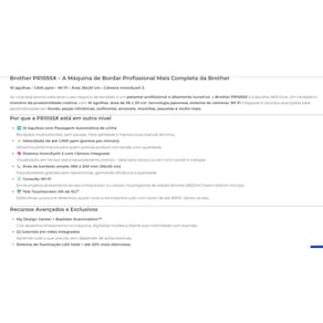 Máquina de bordar automática de cabeça única e 15 agulhas. Servomotor de 150 W, micromotor de passo de 36 V CC para os eixos X e Y. Portas USB e LAN integradas. Painel de controle com tela sensível ao toque de 10?. Suporte de aço sólido com rodas de transporte. Função de corte automático de linha, botão de parada de emergência e detecção de quebra de linha. Velocidade de bordado: 1200 pontos/min. Iluminação: LED. Formato de arquivo: .dst .dsb . e outros. Área de trabalho: 400 x 240 mm. Memória: 100 milhões de pontos ou 400 padrões de bordado. Inclui diversos tamanhos de bastidor e dispositivo de bordado para boné. Peso: 140 kilos.Funções