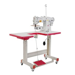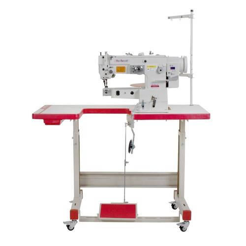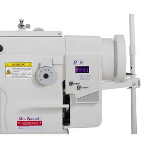SS2153DMXHKCQI Máquina de Braço, Zig zag, transporte duplo, seca, lançadeira grande, 1 agulha, 2 pontos, tamanho do ponto 5mm, largura do zigzag 10mm, altura do calcador 6/12mm, Direct drive 220v, com led, com parada de agulha e controle de velocidade, 2000ppm, mesa em U