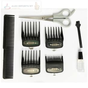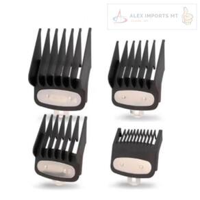 Conteúdo: 4 pentes flexíveis com fixação de ferro, escova de limpeza, óleo, protetor de lâmina, pente e tesoura.