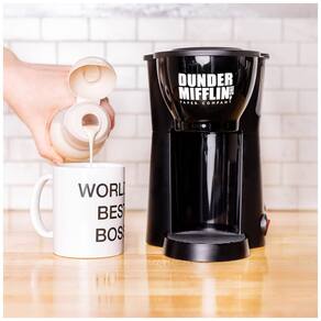 A cafeteira de xícara única The Office com a caneca icônica Boss de Michael Scott leva seu café a um novo patamar, oferecendo uma experiência quente, rápida e saborosa. Esta cafeteira inovadora da Uncanny Brands prepara uma xícara de café moído personalizável de 237 mililitros em menos de 90 segundos, utilizando um filtro de dose única para simplicidade e eficiência.