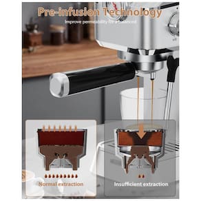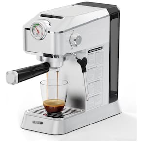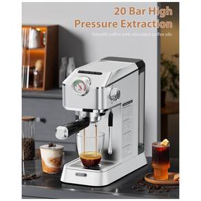 Máquina de café expresso com pressão de 20 bar, espumador de leite em aço inoxidável, caldeira de 1300W, reservatório de água removível de 1,2L e manômetro integrado.Moedor de café integrado