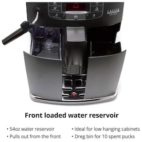 Máquina de café expresso super automática Gaggia Velasca, com varinha de vapor estilo Pannarello, reservatório de água de 1,9 litros, compartimento de grãos de 350 gramas, unidade de infusão removível e ciclos automáticos de enxágue e descalcificação.Moedor de café integrado