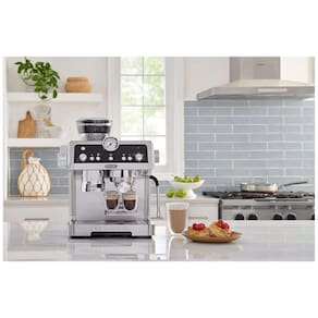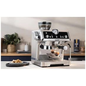 Máquina de café expresso DeLonghi com moedor de rebarbas integrado, capacidade de 1,3L, 1450W, controle de temperatura, bico vaporizador, e design em aço inoxidável.Moedor de café integrado