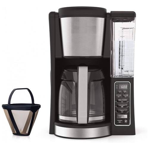 O reservatório de água removível de 1,77 L facilita o abastecimento diretamente na pia. Inclui pausa durante a infusão para servir uma xícara antes do ciclo completo e função para lotes pequenos (1-4 copos), evitando diluição. A placa de aquecimento ajustável mantém o café na temperatura ideal por até 4 horas. Vem com jarra de vidro para 12 copos, colher dosadora integrada, reservatório removível e filtro permanente reutilizável.