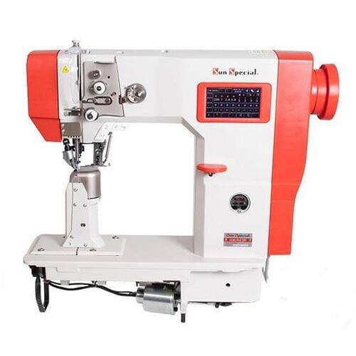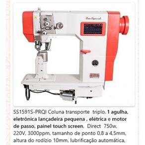 Máquina de Coluna Industrial com Transporte Triplo, 1 agulha, eletrônica lançadeira pequena, motor Direct 750w, 3000ppm, tamanho de ponto 0,8 a 4,5mm, altura do rodízio 10mm, lubrificação automática.Funções