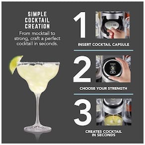 Criação simples de coquetéis Crie inúmeros coquetéis artesanais no conforto de casa sem necessidade de medir ou servir. Basta inserir uma cápsula, colocar um copo no tapete do bar e escolher a dosagem preferida, de mocktail a forte. A máquina extrai automaticamente a bebida espirituosa da garrafa apropriada e prepara um coquetel perfeito em segundos.