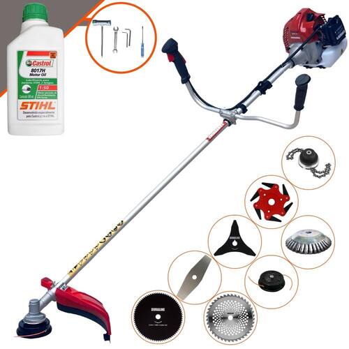 Roçadeira À Gasolina Kawashima BCJ 431L 42,7CC 1,7HP 2T + Faca 3 Pontas + Faca 6 Pontas  + Faca 40 Dentes  + Faca 80 Dentes + Trimmer  + Escova 38 Cerdas + Óleo Castrol Stihl 500ml