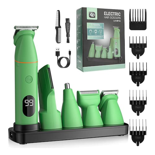 Máquina de cortar cabelo LCD, barbeador elétrico, barbeador, removedor de pelos nasais Marca: Resuxi Método de alimentação: Recarregável Método de limpeza: Lave todo o corpo com água População aplicável: Geral É à prova dágua? Sim Tipo de motor: Motor escovado Processo de invólucro: pulverização (tinta UV, tinta de borracha, tinta metálica, verniz de cozimento de piano, pó perolado) Vida útil da bateria: 3-6 horas (inclusive Aplicável a animais de estimação: Não Capacidade da bateria embutida: 1000mAh-1200mAh (inclusive) Se tem uma bateria embutida: ruído da bateria embutida: 46-70dB Tamanho do corpo: * 3 cm; Especificação da caixa de núcleos: 578g/23* 15* 7cm; Material da lâmina: lâmina de aço inoxidável; Método de carregamento: carregamento USB. Depois de carregar por 2 horas, a duração da bateria é de 90 minutos. Potência do motor: 5 W, tensão universal de 100-240 V; carregamento USB; os produtos incluem: 1 unidade principal * 1 máquina de cortar cabelo * 1 cabeça de barbear * 1 aparador de pelos corporais * 1 máquina de cortar pelo nariz * 1 escova de limpeza * 1 cabo de carregamento USB * 1.