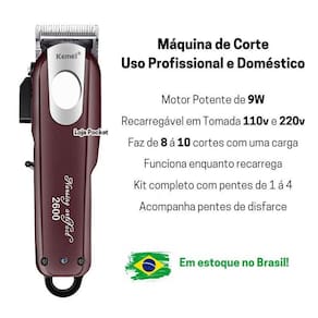 Com esta máquina você terá uma potente ferramenta para uso profissional e doméstico. Este modelo possui um motor de 9W com uma bateria interna de alta duração, fazendo de 8 a 10 cortes por recarga. A máquina é sem fio e recarregável em qualquer tomada 110 ou 220v, acompanha o carregador.