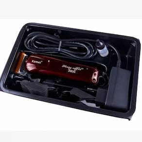 Contém: 1 Maquina Kemei 2600 4 pentes 1 carregador 1 pincel de limpeza 1 óleo 1 protetor de lâmina