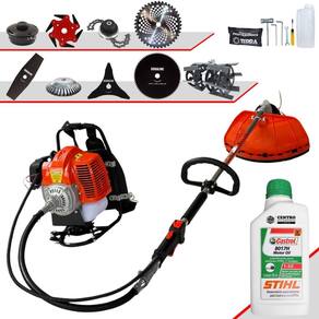Possui motor 2 tempos á gasolina, de 43Cilindradas, 1,7HP de potência que proporcionam maior performance e economia na operação.Seu conjunto de acessórios inclui kit de ferramentas, cinto de suporte duplo almofadado, carretel de nylon e lâmina de corte 40 Dentes.