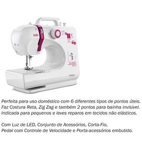Pontos para costura reta e zig zag, braço livre para costura tubular, retrocesso para reforçar o inicio e no final da costura, cortador de linha na tampa frontal. 6 pontos, luz de led, enchedor de bobinas, botão seletor de pontos e acessórios.ESPECIFICAÇÕES TÉCNICASConsumo 0,006 Kw hAlimentação BivoltDimensões (A x L x P) 260 x 300 x 120mmIndicação de Uso DomésticoPeso (kg) 2,7 KgRPM 300 ppmCARACTERÍSTICAS 6 PontosConjunto de AcessóriosCom alça para transporteBivoltCortador de FioCostura RetaRetrocessoPorta-CarretelSeletor de PontosPonto InvisívelCostura Zig ZagUtilitáriosEnchedor de BobinasVídeo de ManejoPonto para Unir TecidosCaseado ManualConteúdo da embalagem:01 Máquina de Costura Portátil Reta Bella BL-1200*Garantia: 12 meses contra defeitos de fabricação.*Objetos de decoração das fotos não estão inclusos.*As cores podem variar conforme monitor/smartphone utilizado para a visualização do anúncio.