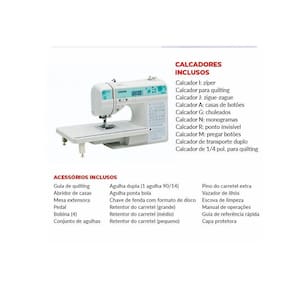 Outros Acessórios Inclusos: Conjunto de agulhas 3 pç=75/11x1, 90/14x1, 100/16x1 ; Agulha de ponta esférica 90/14x1 ; agulha dupla; escova de impeza; abridor de costura; vazador de ilhós