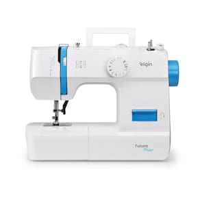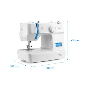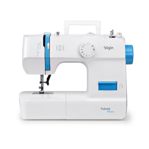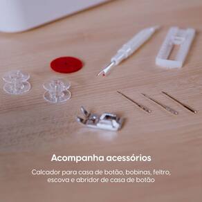 Máquina de costura doméstica portátil com 12 pontos, braço livre, prega zíperes e botões, caseado de botão em 4 passos, lançadeira em aço inox, enchedor de bobinas automático, luz de LED e alça para transporte.Alça retrátil