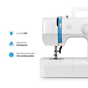 Máquina de Costura Doméstica Portátil Futura Plus Elgin 12 pontos com 12 tipos de pontos, braço livre para costuras tubulares, prega zíperes e botões, caseado de botão em 4 passos, lançadeira em aço inox, enchedor de bobinas automático e luz de LED. Velocidade de 650 rpm.Alça retrátil