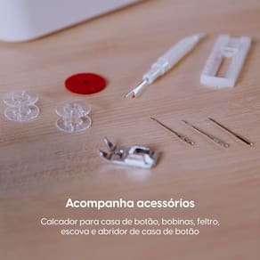 Além disso, a máquina prega zíperes e botões, tornando-se uma aliada indispensável para suas necessidades de costura. O caseado de botão em 4 passos e a lançadeira em aço inox garantem durabilidade e qualidade nos acabamentos.