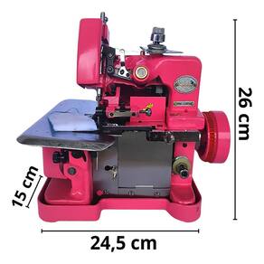 Máquina de costura overlock semi industrial 3 fios com motor acoplado. Peças em aço (incluindo peças internas). Faz acabamento em qualquer tecido. Potência: 150W. Velocidade máxima: 3000 Rpm. Espessura máxima para o tecido: 4mm. Comprimento do ponto: 3,5mm. Tipo da agulha: DC x 1 - 90/14 MY1023A. Ajuste de tensão da linha: Sim. Tipo de tecnologia: Overlock.Funções