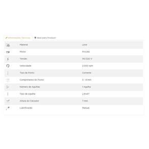 Base cilíndrica 01 agulha Regulagem do tamanho do ponto através de seletor Tamanho máximo de ponto 8 mm Altura máxima do calcador - máximo 12 mm Velocidade da costura - 2500 ppm Montada com motor de baixa velocidade de 1/3 HP.