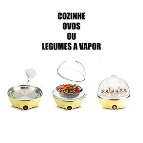 Instruções de uso: Coloque no copo medidor a quantidade de água para atingir o ponto do ovo que deseja. Despeje a água na base de cozimento e coloque o suporte para ovos. Coloque os ovos. Ligue o aparelho e coloque a tampa nunca cubra a tampa com qualquer pano ou objeto . A luz do botão liga/desliga apaga ao finalizar o cozimento.