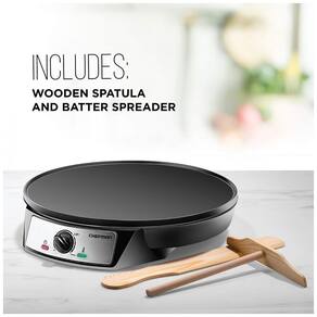 Máquina de crepe elétrica Chefman RJ33 C V2, com 1000W de potência, chapa antiaderente de 12 polegadas, controle de temperatura preciso, luz indicadora de funcionamento e acessórios inclusos.Porta-fio
