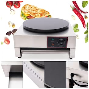 Máquina de crepe elétrica profissional com painel de aquecimento extra grande, concha de aço inoxidável, termostato ajustável (50-300°C) e aquecedor tipo gaveta.Porta-fio
