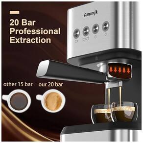 Máquina de café expresso profissional Aeomjk 1350W com bomba italiana de 20 bar, sistema de espuma de leite com tubo de vapor ajustável, design compacto em aço inoxidável, tanque de água removível de 1.76L.Pressão