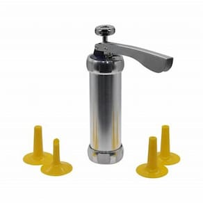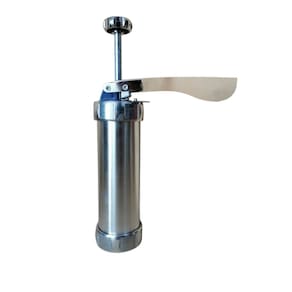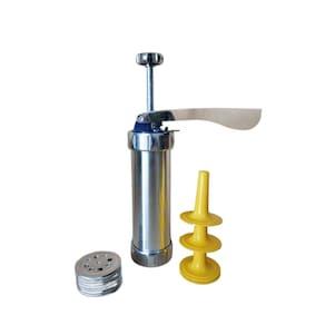 Máquina incrível para fazer biscoitos ou rechear churros, feita de alumínio e plástico. Vem com 4 bicos e 20 (vinte) estênceis ou estênceis de metal. A máquina é de alta qualidade, adequada para uso alimentar. Possui um pistão de 5x16,5 cm + 4 bicos + molde de 20 peças. O preparo é simples, você pode fazer receitas divertidas com os mais pequenos da casa. Cuidado: Lave com água e sabão que não seja abrasivo, deixe secar ao ar livre. Armazenar em local fresco, sem umidade. É fácil de usar e, com o uso adequado e bem cuidado, tem uma longa vida útil. Material: Alumínio Comprimento: 22 cm Diâmetro: 6 cm