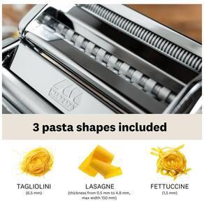 A famosa Máquina de Fazer Massas MARCATO Atlas 150 rola e corta a massa para preparar lasanha, fettuccine e tagliolini de forma tradicional em casa. Feita na Itália em aço cromado, esta máquina inclui cortador de massa, manivela manual e grampo de fixação. Com capacidade para laminar a massa até 150 milímetros de largura em 10 espessuras diferentes, de 0,6 a 4,8 milímetros, garantindo uma textura consistente, tempo de cozimento e sabor perfeitos. A Atlas 150 não é compatível com lava-louças. Possui conexão para motor elétrico de massas e 12 acessórios de corte de massas vendidos separadamente. Material resistente em aço niquelado, aço cromado e ABS.