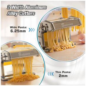 Cansado das máquinas de fazer massas com cheiro de metal ou plástico? A máquina de fazer massas da Sailnovo é feita de material de grau alimentício. Com 9 opções de espessura ajustável, você pode escolher a textura desejada, desde 3 mm até 0,5 mm para peles de dumpling. Com diferentes larguras, é perfeita para preparar variedades de massas como espaguete e lasanha. Presenteie seus amigos com esta máquina manual de fazer massas, que é fácil e higiênica de usar. Essencial na cozinha para os amantes de massa!