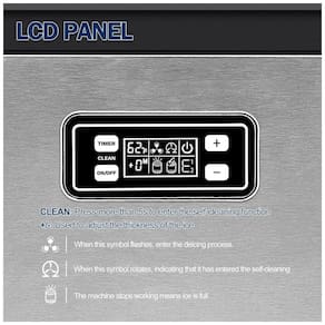 A Máquina de Gelo Comercial EUHOMY IM-02-S2 produz até 200 lbs (90,7 kg) de cubos de gelo por dia, com bin de armazenamento para 65 lbs (29,5 kg). Projetada para instalação sob balcão, atende demandas em bares, restaurantes, hotéis e cozinhas internas ou externas. Certificação ETL garante conformidade com normas de segurança para uso comercial e residencial. Painel LCD inteligente exibe temperatura ambiente, permite ajuste de tamanho dos cubos via tempo de ciclo e ativa limpeza automática com botão dedicado.