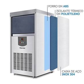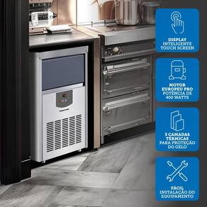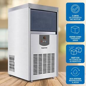 Característica técnicas: Suporte técnico em todo o território nacional, Temos assistência técnica no Brasil inteiro Moderno display digital: É possível regular a espessura do gelo, de acordo com a sua necessidade Baixo consumo de água e energia Desempenho com baixo consumo de água e energia Gelo potável e filtrado: Filtro de água embutido Revestido com o melhor Aço: Aço inox 304, o melhor inox contra corrosão e ferrugem Máquina completa: Pá coletora, conexão e mangueiras inclusas. dreno e filtro de água Instalação simplificada: Tudo simples e intuitivo no processo de instalação Maior garantia do mercado: 03 anos no compressor e 01 ano de fábrica Produz até 38/kg por dia Reservatório que comporta até 12 litros Filtro de água embutido Potência: 400W Material: Aço Inox 304 Maior cubo do mercado: 28 x 28 x 22 mm. 22 x 22 x 22 mm
