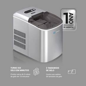 Principais características: Potencia: 120w Capacidade: até 15kg/dia Reservatório de agua: 2,1l Não necessita instalação hidráulica Dreno para limpeza Visor em acrílico transparente Reservatório de gelo: aproximadamente 1kg Compressor ecológico: gás 134a Super silencioso Painel eletrônico digital Indicador de funcionamento Indicador de falta de água Indicador de reservatório de gelo cheio Seletor de tamanho de gelo: pequeno ou grande Acompanha cesto de gelo e pazinha coletora